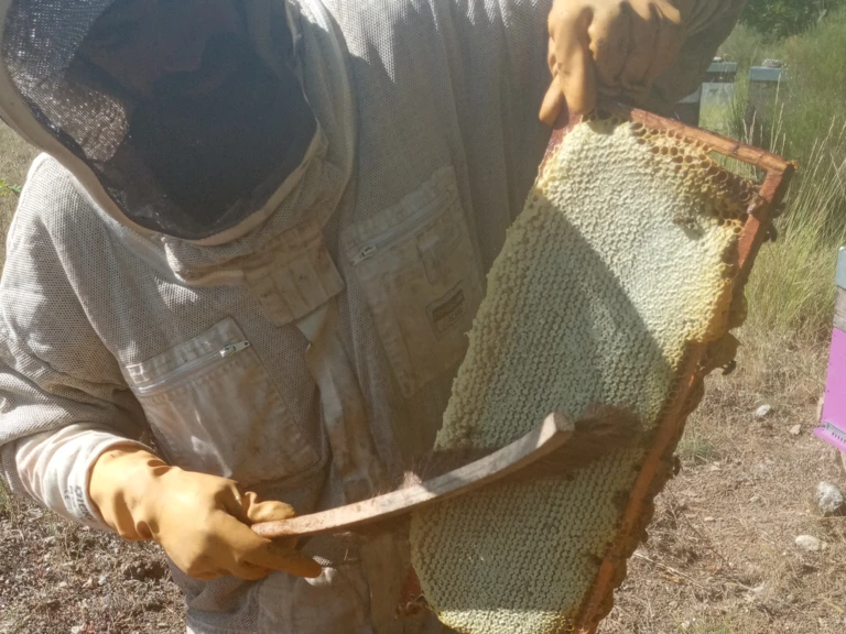 Nos abeilles cirent naturellement leurs cadres, nous ne leur donnons pas de cire gauffrées, ces feuilles de cire pré-alvéolées que les abeilles doivent étirer. Parce que les abeilles savent cirer toutes seules et que l'environnement est tellement pollué aujourd'hui qu'il est très difficile de trouver dans le commerce des cires vraiment biologiques, exemptes de produits chimiques et de pesticides. Nos ruchers étant hors zones traitées, cela nous permet de ne pas introduire de molécules chimiques dans nos ruches et de respecter la physiologie des abeilles.